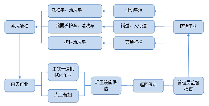 | 清扫保洁系统 | 所有道路机械化,其余以人工为主,所有道路、街巷全面整治,全日保洁管理 | 主要道路机械化,其余人工保洁为主,硬化道路、主要街巷全面整治,全日保洁管理 | 全部人工保洁,主要道路实施全日保洁,主要街巷定期清理整治 |