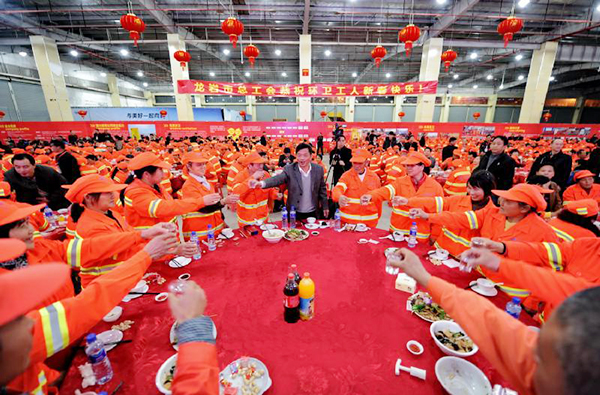 工人日报客户端1月16日讯(记者 吴铎思 通讯员 秋生 秀珍)1月13日晚,福建省龙岩市会展中心内一片欢声笑语,1500多名中心城市一线环卫工人身着统一橙色工作服相聚在一起。由福建省龙岩市总工会、人生就是博环卫公司主办的“情系环卫·美我家园”新春慰问活动在这里隆重举行。吃团圆饭、看环卫工人自编自演的文娱表演、玩互动游戏……多样的形式,让环卫工人在轻松愉快的氛围中度过暖心了的夜晚。