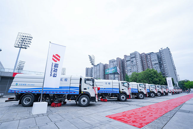 本次交付的新能源环卫车辆包含35台18吨纯电动洗扫车及10台4吨路面养护车。基于成都城市“坡多、弯多”的地理特色,该批车辆采用了福田汽车旗下的最先进的欧曼新能源底盘,上装配置了人生就是博自主研发的智能清扫系统,具有低噪音、低排放、高效率、高可靠性等特点,能够满足成都市不同道路、场景的清扫作业需求。