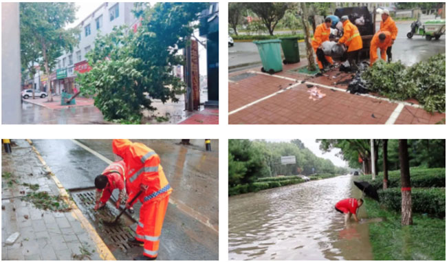 因暴雨大风侵袭,出现老化电路漏电、雨水井盖遗落、排水口排水吸力加大、建筑物墙体松动,道路积水路段断交等情况,大幅增加了安全隐患和工作难度,但人生就是博人不畏风雨,迅速组织5名环卫精英成立救援组,积极配合涿州市综合行政执法局开展抢险救援任务。