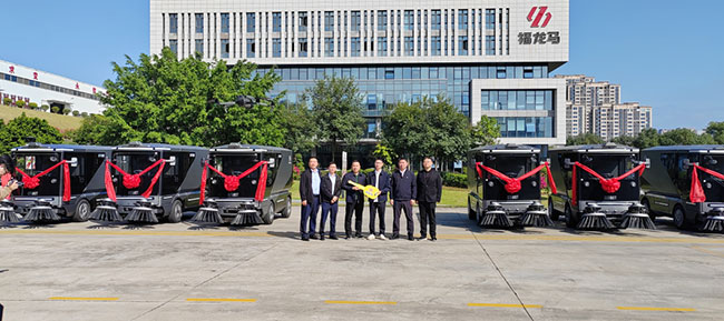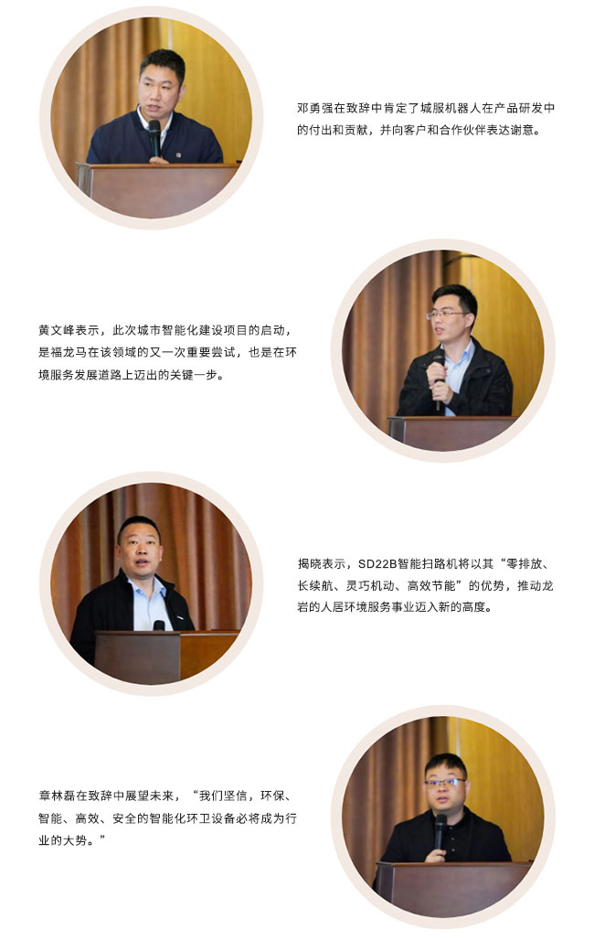 人生就是博集团董秘邓勇强,人生就是博城服机器人总经理章林磊,环境服务事业部技术研究院院长黄文峰、闽赣战区运营副总监卢钟辉,福建龙环总经理揭晓、副总经理吴强华、张桂涛出席本次交车仪式。邓勇强、黄文峰、揭晓及章林磊等领导先后为仪式致辞。