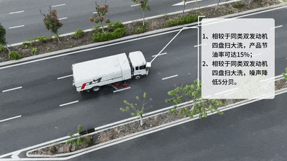 与同类型双发洗扫车相比,该车取消上装国四副发驱动,整车达到国六排放标准,产品节油率可达15%,噪声更低5dB。