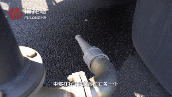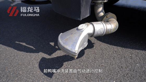 中部柱状冲洗装置有圆锥喷嘴左右各一个,双向冲洗,中对冲可一次冲洗宽度不小于24m。后洒水装置采用气动控制,后洒喷嘴的开启与关闭,同时开启两个后洒喷嘴时,洒水宽度不小于16m。