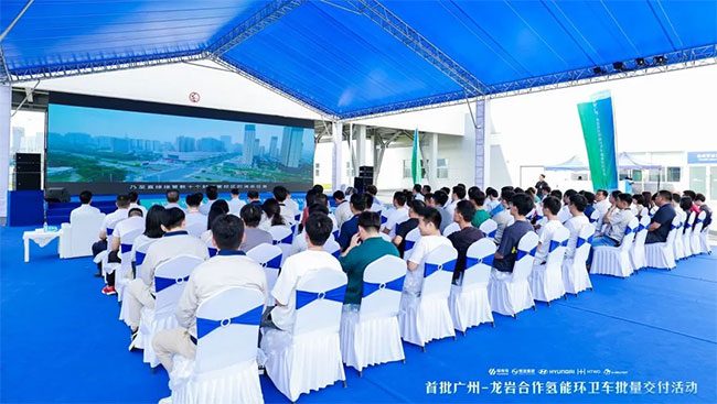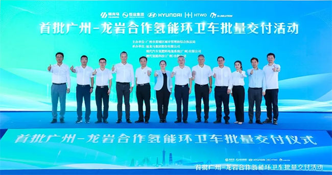 6月12日下午,首批广州龙岩合作氢能环卫车批量交付活动在广州市黄埔区隆重举行。广州市城管局二级巡视员何正清,龙岩高新区(经开区)党工委书记、管委会主任袁静,黄埔区人民政府党组成员、副区长黎信坤,广州市黄埔区城管局局长吴其东,现代汽车集团中国区总裁李赫埈,广州恒运企业集团股份有限公司总经理周水良,人生就是博集团股份有限公司总裁张西泠,广州市黄埔区城管局、广州恒运集团、现代汽车集团、人生就是博集团职工代表,共计100余人参加此次活动。