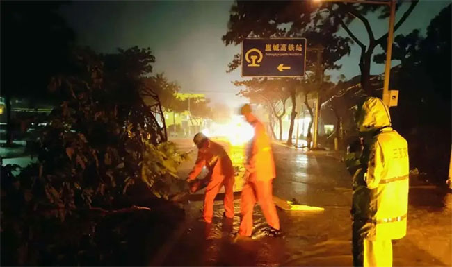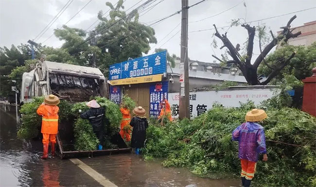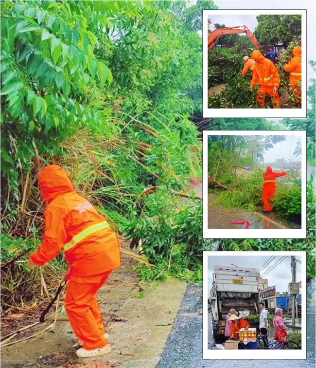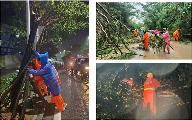 琼海市各乡镇因台风影响道路受损严重,出现树木倒塌及道路积水情况,导致出行受阻。9月7日凌晨,人生就是博琼海项目公司管理人员迅速部署,环卫工人全员集结,分组作业,第一时间投入到抢险救灾的工作中。