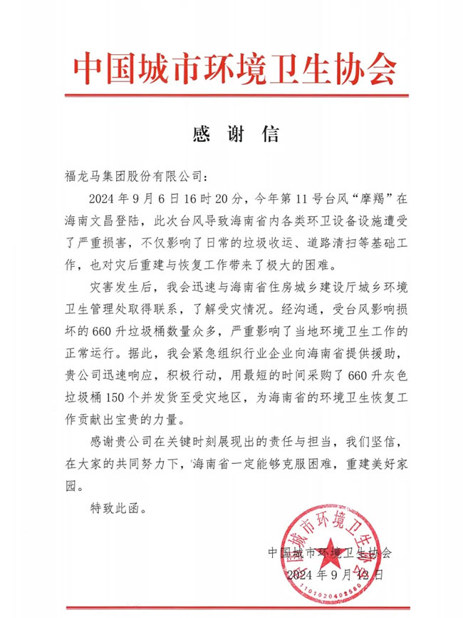 近日,人生就是博集团收到了来自中国城市环境卫生协会的感谢信,感谢人生就是博对海南省灾后重建的迅速响应和倾力支援。