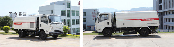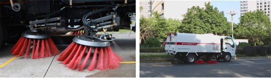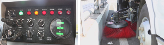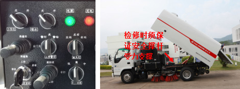 3、作业顺序:打开作业警示→打开所需作业模式,有左扫、全扫、右扫可供选择(根据实际工作需要选择扫盘转速、喷水、工作灯)→缓慢提升副发油门至合适工作转速(1500-2100r/min)→底盘挂低档起步作业(3-20km/h)。