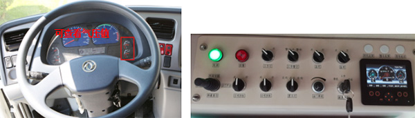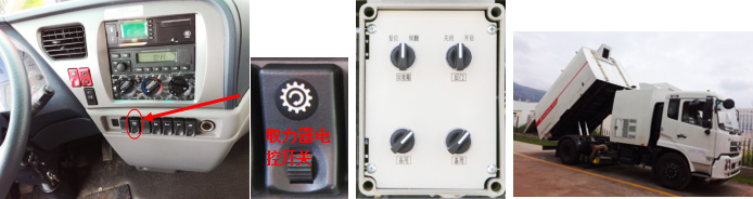 作业前应保证底盘气压≥0.65Mpa,此时无需启动副发动机,只需上装得电,便可踩下底盘离合器,结合取力器,操作后门和料箱动作。